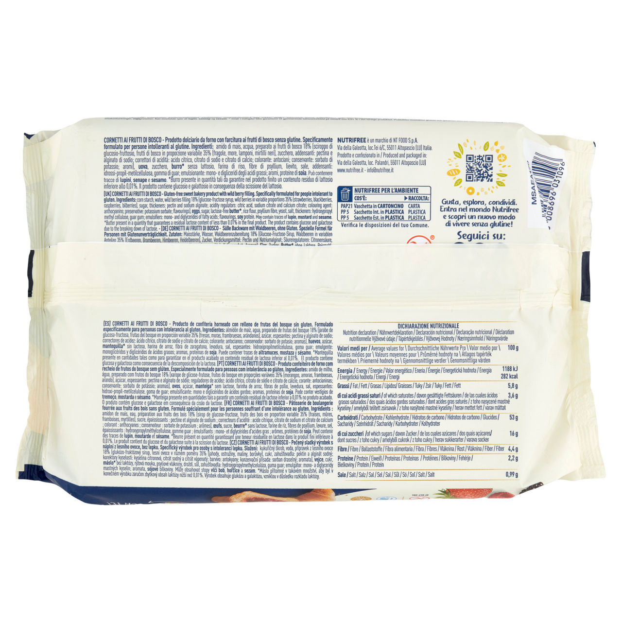 Squisito ripeno ai Frutti di Bosco Marmellata di frutti di Bosco Fonte di fibre Specificamente formulato per persone intolleranti al glutine 4 Golose monoporzioni Sempre con te! Cornetti ai frutti di bosco - Prodotto dolciario da forno con farcitura ai frutti di bosco senza glutine. Specificamente formulato per persone intolleranti al glutine