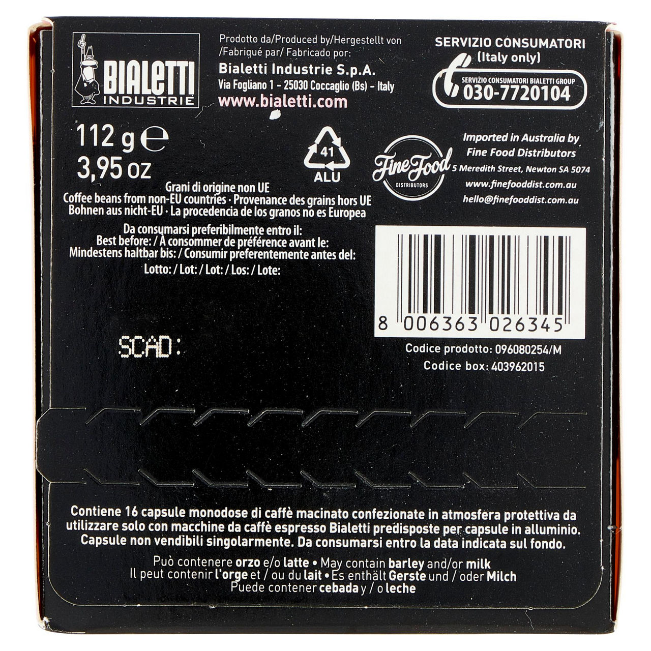 Contiene 16 capsule monodose di caffè macinato confezionato in atmosfera protettiva da utilizzare solo con macchine da caffè espresso Bialetti predisposte per capsule in alluminio. Capsule non vendibili singolarmente.