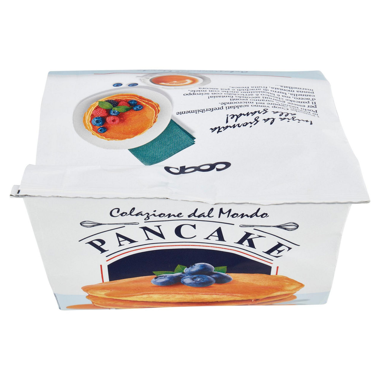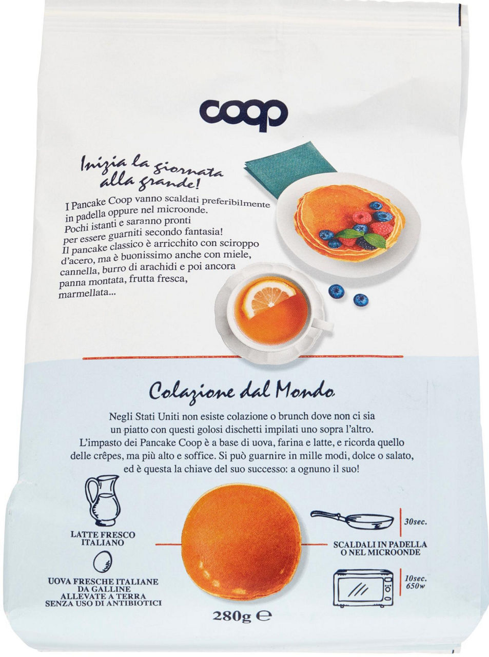 Inizia la giornata alla grande! I Pancake Coop vanno scaldati preferibilmente in padella oppure nel microonde. Pochi istanti e saranno pronti per essere guarniti secondo fantasia! Il pancake classico è arricchito con sciroppo d'acero, ma è buonissimo anche con miele, cannella, burro di arachidi e poi ancora panna montata, frutta fresca, marmellata... Colazione dal Mondo Negli Stati Uniti non esiste colazione o brunch dove non ci sia un piatto con questi golosi dischetti impilati uno sopra l'altro. L'impasto dei Pancake Coop è a base di uova, farina e latte, e ricorda quello delle crêpes, ma più alto e soffice. Si può guarnire in mille modi, dolce o salato, ed è questa la chiave del suo successo: a ognuno il suo! Latte fresco italiano Uova fresche italiane da galline allevate a terra senza uso di antibiotici