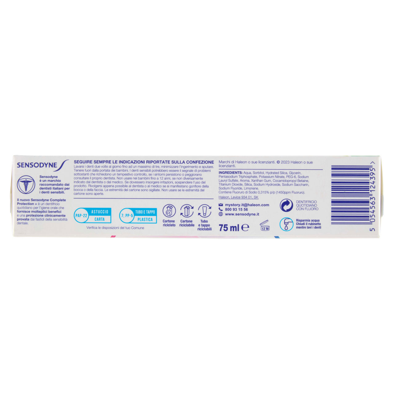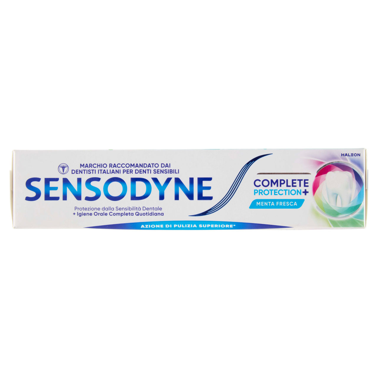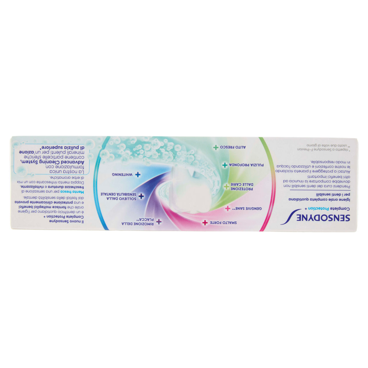 Igiene orale completa quotidiana per i denti sensibili Prendersi cura dei denti sensibili non dovrebbe comportare la rinuncia ad altri benefici importanti Aiutaci a proteggere il pianeta riciclando le nostre confezioni e utilizzando l'acqua in modo responsabile. + Alito fresco + Pulizia profonda + Protezione dalle carie + Gengive sane** + Smalto forte + Rimozione della placca** + Sollievo dalla sensibilità dentale + Whitening **usato due volte al giorno Il nuovo Sensodyne Complete Protection + è un dentifricio quotidiano per l'igiene orale che fornisce molteplici benefici e una protezione clinicamente provata dai fastidi della sensibilità dentale. Menta fresca per una sensazione di freschezza duratura e rivitalizzante. Doppia menta rinfrescante con un mix di erbe aromatiche. La nostra unica formulazione con Advanced Cleaning System, contiene particelle sferiche minerali pulenti per un'azione di pulizia superiore* *rispetto a Sensodyne F-Previon Cartone riciclato Cartone riciclabile Tubo e tappo riciclabili Risparmia acqua - Chiudi il rubinetto mentre lavi i denti