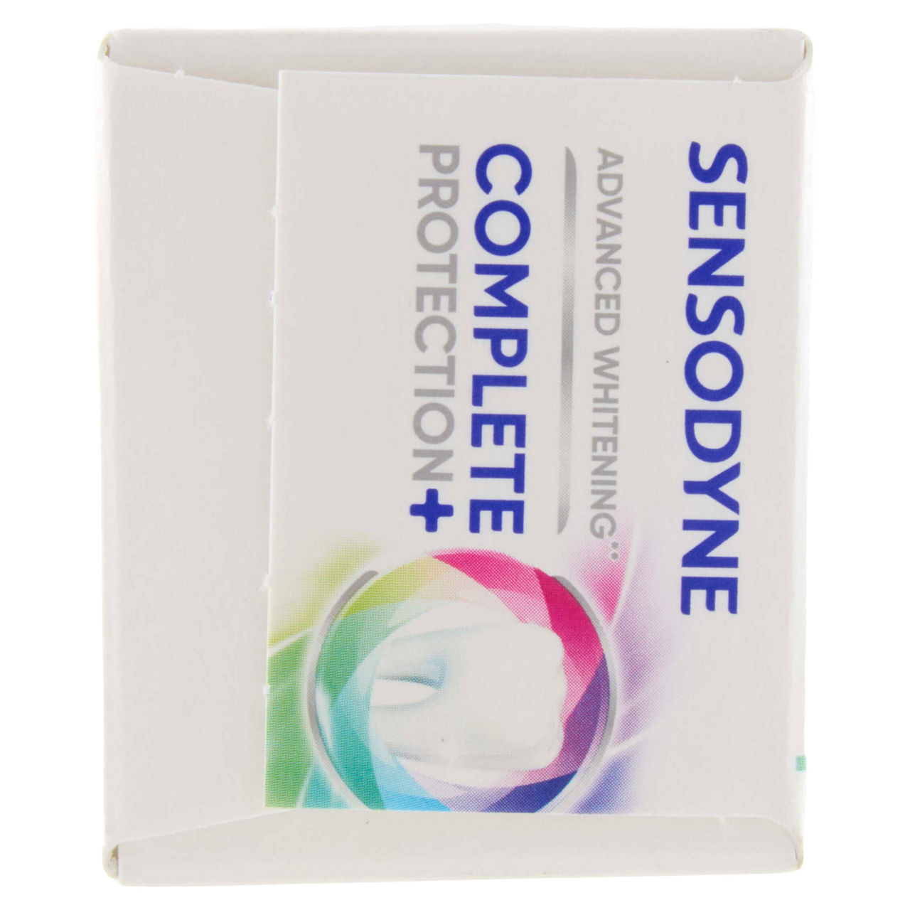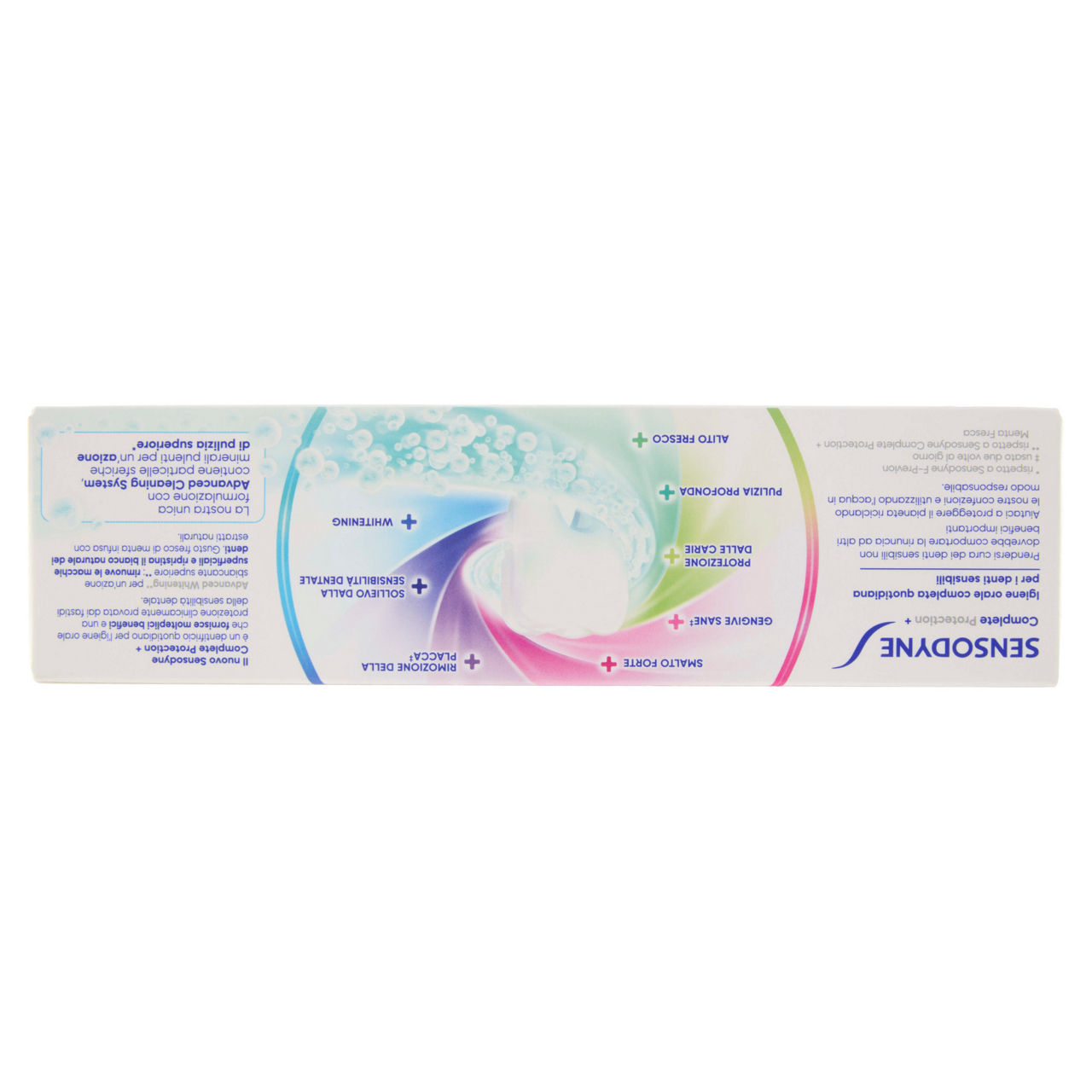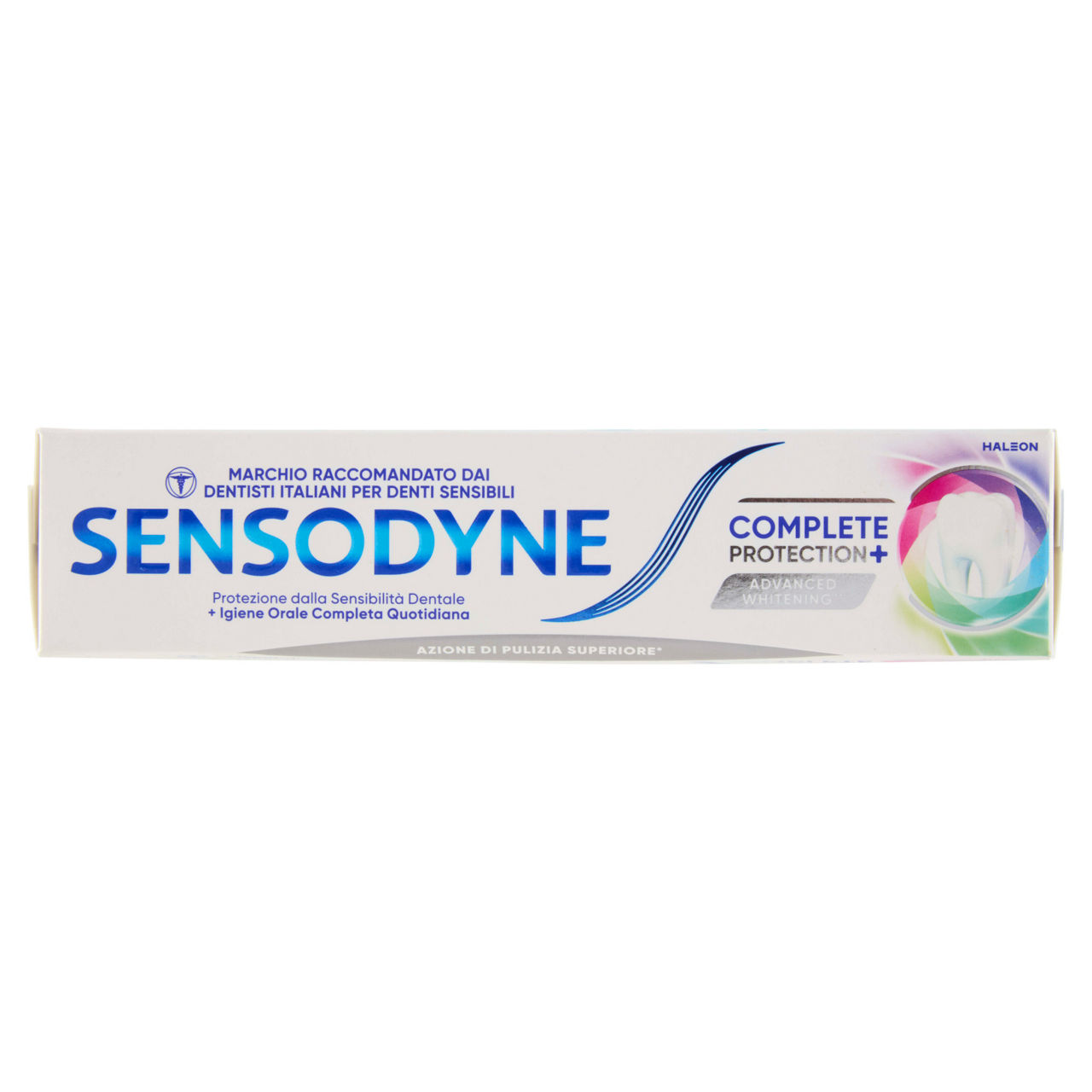 Igiene orale completa quotidiana per i denti sensibili Prendersi cura dei denti sensibili non dovrebbe comportare la rinuncia ad altri benefici importanti Aiutaci a proteggere il pianeta riciclando le nostre confezioni e utilizzando l'acqua in modo responsabile. + Alito fresco + Pulizia profonda + Protezione dalle carie + Gengive sane‡ + Smalto forte + Rimozione della placca‡ + Sollievo dalla sensibilità dentale + Whitening ‡usato due volte al giorno Il nuovo Sensodyne Complete Protection + è un dentifricio quotidiano per l'igiene orale che fornisce molteplici benefici e una protezione clinicamente provata dai fastidi della sensibilità dentale. Advanced Whitening**: per un'azione sbiancante superiore**: rimuove le macchie superficiali e ripristina il bianco naturale dei denti. Gusto fresco di menta infusa con estratti naturali. **rispetto a Sensodyne Complete Protection + Menta Fresca La nostra unica formulazione con Advanced Cleaning System, contiene particelle sferiche minerali pulenti per un'azione di pulizia superiore* *rispetto a Sensodyne F-Previon Sensodyne Complete Protection + è un dentifricio al fluoro che può essere usato tutti i giorni e che offre sollievo dalla sensibilità dentale. Cartone riciclato Cartone riciclabile Tubo e tappo riciclabili Risparmia acqua - Chiudi il rubinetto mentre lavi i denti