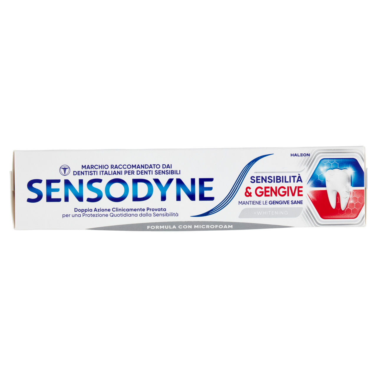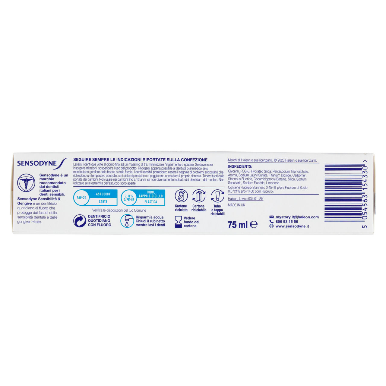 Sensibilità dentale e fastidi gengivali? Molte persone con i denti sensibili hanno anche fastidi gengivali. La sensibilità dentale si manifesta quando la dentina esposta entra a contatto con il freddo, il caldo, i cibi e le bevande dolci e acidi. I fastidi gengivali possono essere causati da un accumulo di placca batterica. Doppia azione per Denti Sensibili e Fastidi Gengivali Aree sensibili e placca attorno alle gengive Forma uno strato protettivo sulle aree sensibili La formula micro foam raggiunge e aiuta a rimuovere i batteri della placca Aiuta a proteggere dalla sensibilità dentale a mantiene le gengive sane È clinicamente provato che Sensodyne Sensibilità & Gengive dona sollievo ai denti sensibili e mantiene le gengive sane. Crea uno strato protettivo attorno alle aree sensibili dei denti, con una nuova formula a bassa abrasività. Aiuta a combattere la placca batterica raggiungendo anche le aree più difficili tra i denti e lungo il bordo gengivale. La formula aiuta a rimuovere le macchie superficiali per restituire il bianco naturale dei denti in modo delicato. Sensodyne Sensibilità & Gengive è un dentifricio quotidiano al fluoro. Sensodyne Sensibilità & Gengive è un dentifricio quotidiano al fluoro che protegge dai fastidi della sensibilità dentale e delle gengive irritate.