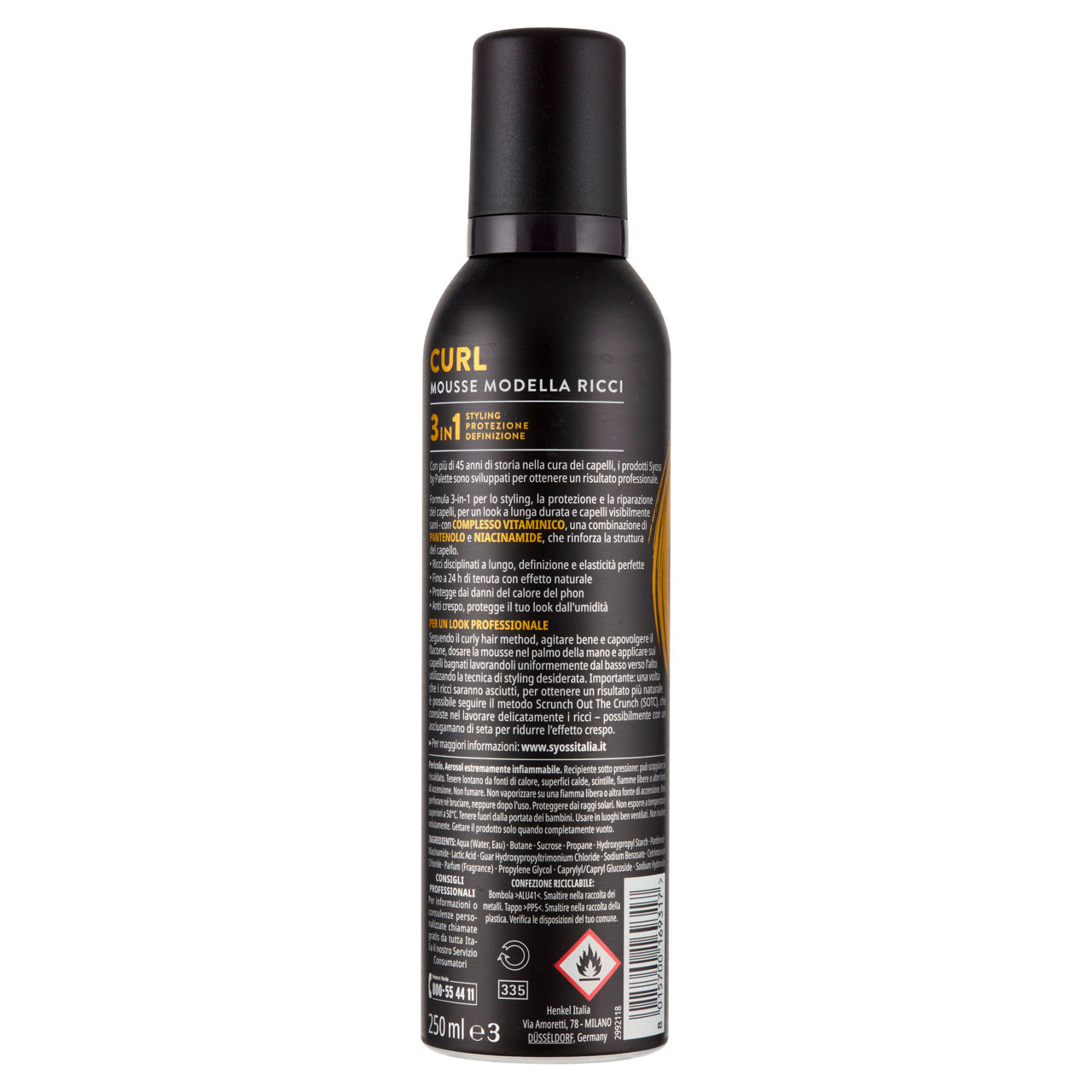 Preparazione e utilizzoPer un look professionale Seguendo il curly hair method, agitare bene e capovolgere il flacone, dosare la mousse nel palmo della mano e applicare sui capelli bagnati lavorandoli uniformemente dal basso verso l'alto utilizzando la tecnica di styling desiderata. Importante: una volta che i ricci saranno asciutti, per ottenere un risultato più naturale è possibile seguire il metodo Scrunch Out the Crunch (SOTC), che consiste nel lavorare delicatamente i ricci - possibilmente con un asciugamano di seta per ridurre l'effetto crespo. - Per maggiori informazioni: www.syossitalia.it Consigli professionali Per informazioni o consulenze personalizzate chiamate gratis da tutta Italia il nostro Servizio Consumatori Numero Verde 800-55 44 11