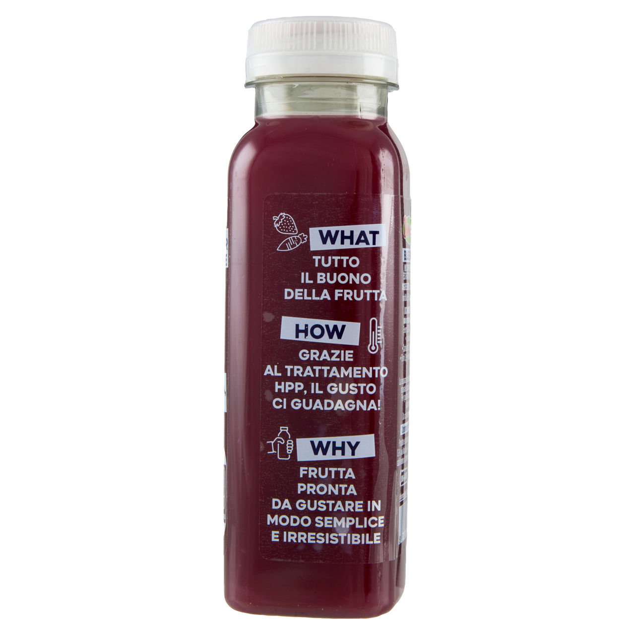What Tutto il buono della frutta How Grazie al trattamento HPP, il gusto ci guadagna! Why Frutta pronta da gustare in modo semplice e irresistibile Insieme per l'ambiente Bottiglia realizzata con il 50% di plastica riciclata Bevi, gusta, ricicla