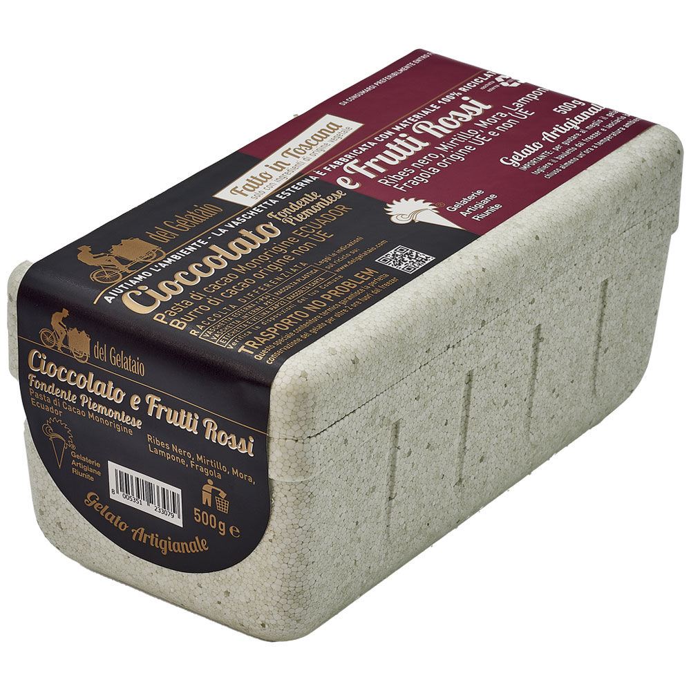 Gelato artigianale al cioccolato fondente piemontese e frutti rossi (ribes nero, mirtillo, mora, lampone, fragola)